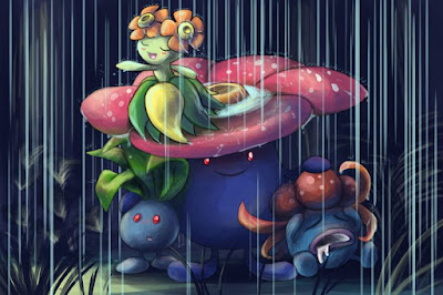 Bellossom, on the other hand, has a quite different flavor than Oddish, Gloom and Vileplume. While those Pokémon are predominantly nocturnal and toxic (especially Gloom, who secretes a sticky drool-like nectar from its mouth to attract prey and releases a foul fragrance from the petal on its head that can be smelled from a mile away, and Vileplume, who shakes or burst its petals into bloom to create highly allergenic and toxic pollen with which it paralyzes its prey), Bellossom is actually a happy Pokémon that is often seen dancing and chanting. It dances when cloudy weather persists (as a ritual to summon the sun), or when the period of heavy rainfall ends and it is drawn out by the warm sunlight. That's not strange, regarding the fact that Gloom actually evolves into Bellossom when it is exposed to a Sun Stone. Considering the fact that Bellossom is such a happy Pokémon, almost resembling a hula dancer, it is not illogical that Gloom loses its poison typing when it evolves into Bellossom. I feel like Bellossom should have gotten fairy as its secondary typing, however, as this type wouldn't fit it badly at all. That way, Moonblast and Dazzling Gleam would have been STAB moves that would have hit harder than Vileplume's Moonblast attacks. Bellossom is more defensive than it is offensive, though, so investments in its defenses might have more effect than investments in an offensive Bellossom. A moveset that consists of Sleep Powder, Giga Drain, Sunny Day, and either Synthesis or Moonlight is an excellent moveset to ensure its durability. Sunny Day activates Bellossom's ability Chlorophyll, which doubles its speed in harsh sunlight, while both Moonlight and Synthesis heal 75% of its health while the sun is still up.