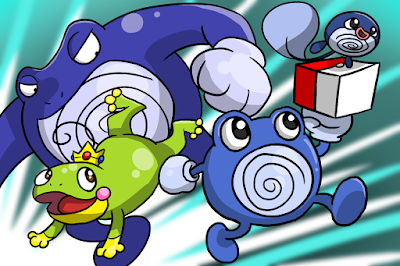 Alright then, I'll admit that Poliwag is a tadpole. And quite honestly, it is a creepy tadpole at that, because the spiral pattern on its belly is supposed to represent how the intestines of real-life tadpoles are sometimes seen through their transparent skins. Gross. I'm not particularly fond of slimy amphibian things in the first place, but that gets even worse when their intestines are clearly visible. One could call such a phenomenon fascinating, but I'm not buying it. What I'm also not buying is the whole Poliwhirl-being-a-tadpole thing. You know, when Poliwag evolves into Poliwhirl, the tail disappears and arms and hands (with what are supposedly gloves attached to it) are added, which really makes me think Poliwhirl isn't supposed to be a tadpole anymore, even though it is still a middle-stage Pokémon and the spiral pattern, still resembling intestines, remains. Admittedly, due to their round bodies and big eyes, both Poliwag and Poliwhirl have a somewhat adorable appearance, which might make one argue that both are tadpoles. But I refuse to believe that one of Poliwhirl's final evolutions, Poliwrath, is a tadpole. It's a grown-ass frog, goddammit!