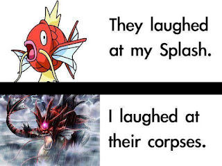And with pathetic I actually mean pathetic. Magikarp's level-up movepool has been the same since Gen. II, consisting of only Splash, Tackle and Flail, and its stats are terrible across the board. Well, its speed is decent, but it's useless when you have no offensive or defensive stats whatsoever. But do you see the memes below and on the right? That's right, Magikarp will fuck you up when it evolves into the fearsome Gyarados, but how does that excalate so quickly? Well, Magikarp is based on an Asian carp (although it does look a bit like a koi carp), a kind of fish that is easily startled and can jump 8 to 10 feet in the air, hence Magikarp's 'ability' to splash. Magikarp's evolution into Gyarados refers to a Chinese legend about how carp that leapt over the Dragon Gate, which many believe is located behind several waterfalls and cataracs in China, would become dragons, but it's mainly an allegory of the drive and efforts needed to overcome obstacles. This is also demonstrated in the side game Pokémon Snap, in which a Magikarp splashes its way into a waterfall and evolves after taking certain steps.