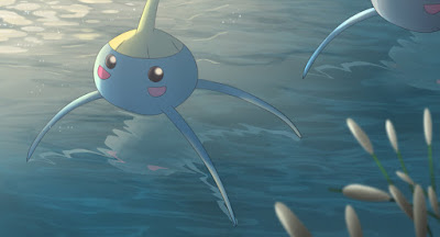 More on that later, as I'll discuss Surskit first, a water strider Pokémon that also vaguely resembles a curling stone. Too bad Game Freak never actually did something with that curling stone design, because every bit of Surskit's character seems to be based on the water strider: the antenna on Surskit cap-like head secretes a thick, sugary syrup or a sweet scent, the former as a defense mechanism (although it sometimes doesn't work, as some Pokémon love to eat the syrup) and the latter to attract prey. Oil is secreted from the tips of its feet, which enables it to skate across large bodies of water. It would have been nice if at least one Pokédex entry mentioned that people often grab some Surskit by their antennae and push them across the water in order to see which ones comes farthest. It's cruel, but people have no conscientious objection to throwing Pyukumuku back into the ocean, so this shouldn't be a problem either, right? Right?